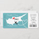 A fun but stylish wedding invitation in a boarding pass/ticket style for couples getting married abroad in the beautiful Island of Cyprus which is shown in a white map silhouette on teal blue with sweet red love hearts, aeroplane silhouette and white beads swirling into a heart shape. The reverse of the boarding pass has a pretty elegant lacy pattern.