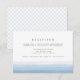 Élégantes cartes d'invitation de réception de mariage aquarelle présentent un effet de dégradé ombré dip dye en bas dans un bleu ciel aéré. Personnalisez avec vos informations de réception, heure, lieu et adresse en gris charbon foncé en bloc et typographie script. Les cartes d'insertion de réception se retournent sur un motif subtil de treillis de diamants en bleu pâle et blanc. Conçues pour coordonner avec notre collection d'invitations de mariage Dip Dye en Ciel.