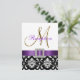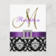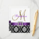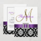 L'élégance sophistiquée est transmise par ce magnifique modèle de carton d'invitation à la réception de mariage. Un motif floral en damassé noir et blanc sert de fond à un effet photo de l'initiale en métal doré M et d'un ruban de satin violet et d'une broche en diamant TOUT IMPRIMÉ sur un carton plat. Un moyen parfait d'inviter vos invités à votre réception de mariage. Motif damassé contemporain mais classique avec un design qui vous permet de personnaliser le devant avec vos noms ou le mot "réception" et le verso est libre pour ajouter votre texte personnalisé d'invitation à la réception de mariage. L'invitation à la réception de mariage est prévue pour l'initiale monogramme "M". Pour d'autres lettres ou couleurs de ruban ou de damassé, veuillez contacter le concepteur à luxuryweddinginvitations@gmail.com. Conception de la mise en page par Elke Clarke