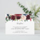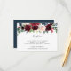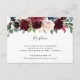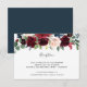 Conçu pour s'harmoniser avec notre collection de mariages en fleurs radiantes, cet élégant boîtier de réception botanique comprend un spray de marsala bordeaux, des fleurs rose rousse et bleu marine avec un feuillage d'eucalyptus vert, surplombant vos détails de réception de mariage, lieu et timing.