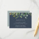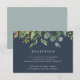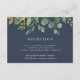 Conçue pour aller avec notre collection de mariage Eucalyptus Grove, cette carte de réception botanique luxuriante présente un spray de feuilles aquarelles et de feuillage d'eucalyptus vert, avec vos informations de réception, heure et adresse, en blanc sur un fond bleu marine fumé.