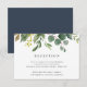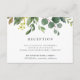 Conçue pour aller avec notre collection de mariage Eucalyptus Grove, cette carte de réception botanique luxuriante présente un spray de feuilles aquarelles et de feuillage d'eucalyptus vert, surmontant vos détails de réception, heure et adresse.