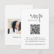 Carte rsvp de style minimaliste noir et blanc avec un script de calligraphie moderne et élégant. Le code QR peut être analysé pour accéder au site Web du mariage. L'arrière a une place pour votre photo avec une bordure gris clair et le nom du couple sous ou peut être laissé vide.