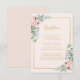 Cette élégante carte de réception de mariage florale et vierge est parfaite pour votre mariage boho et botanique de printemps rose. Le design comprend un cadre en feuille d'or accompagné d'un simple rose de champagne de pêche à l'aquarelle, d'une végétation minimaliste d'eucalyptus vert sauge et d'un fleur sauvage de pavot de corail neutre et moderne. Le design est luxueux, idéal pour un classique, élégant, délicat, chic été, automne ou mariage d'hiver. N'hésitez pas à nous contacter pour toute question concernant le design du produit ; encouragez !