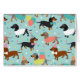 Cute birthday party dachshund dogs with black, tan and dapple coats dressed in cute birthday outfits with balloons, cake and confetti pattern.