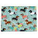 Cute birthday party dachshund dogs with black, tan and dapple coats dressed in cute birthday outfits with balloons, cake and confetti pattern.