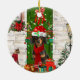 Dachshund Dog sitting outside decorated home with Christmas wreath, Christmas tree is a perfect Christmas gift idea for dog lovers.