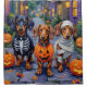 Adorable Dachshunds dressed in fun Halloween costumes carry pumpkin buckets while trick-or-treating under the moonlit sky. This festive design highlights the breed’s long body, playful spirit, and loyal nature, perfectly capturing the spooky yet cheerful atmosphere of Halloween night. A delightful celebration for dog lovers and Halloween fans alike.