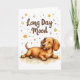 Cute cartoon illustration of a Dachshund lying flat on its belly with eyes closed and tongue slightly out, surrounded by doodle-style stars and sparkles. Designed in a cheerful greeting card style with the funny text: “Long Day Mood.” A playful card that’s perfect for Dachshund lovers or anyone who knows the joy of a good nap.