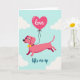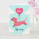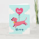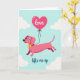 This greeting card shows a sweet, stylized dachshund in candy pink floating in a sky-blue background. The dog has a bright yellow bow tie and a happy, relaxed expression, with its legs stretched out as if it’s drifting through the air. A thin string connects the dog to a large fuchsia, heart-shaped balloon above it. On the balloon, the word “love” appears in a flowing script style, standing out clearly against the pink heart. Soft white clouds sit in the background, adding to the light, airy setting. Beneath the dog and balloon, the phrase “lifts me up” is written in a simple, smooth script near the bottom of the card. It’s a warm, romantic design that feels perfect for a Valentine message ❤️
