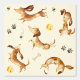 Playful dachshund puppies with tennis ball, paw prints, bones, and bumble bee on pastel yellow background ©OctopusArts & DecampStudios