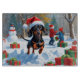 A playful Dachshund runs through the snowy winter scene, wearing a festive red Christmas hat. This charming design highlights the breed’s long body, short legs, and spirited personality while capturing the warmth and joy of the holiday season. A delightful winter moment full of festive cheer.