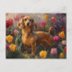 A playful dachshund stands surrounded by a burst of colourful spring tulips, capturing the joy and beauty of the season. The cheerful dog and vibrant flowers create a heartwarming scene, filled with the freshness and energy of springtime.