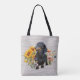 Monogrammed dachshund dogs tote bag. Both sides have images of dachshunds. One is black and the other is brown. They stand and sit among wildflowers and sunflowers. One side has an initial template, which can be deleted if you prefer the bag blank. Faux wood grain is the wrap around background image. Bags are lined, have a black handle, and come in two sizes.