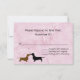 Cute dog themed wedding response RSVP card, done with graphics of a pink distressed background. Cute silhouettes of a brown and a black dachshund, with pink hearts between them decorates the bottom left, of the card. All text is customizable to suit your event needs. Matching products available.