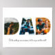 This is a photo collage that spells out the word DAD along with a custom message. This is the perfect gift for dad for father’s day, his birthday or Christmas. Frame not included.
