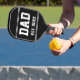 This black pickleball paddle has white display text you can edit to show a custom message. (Shown: Dad Est. 20xx) In particular, you can change the year to show when the recipient became a dad.