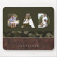 Celebrate father's day with our rugged and masculine camo and faux leather personalized "DAD" mouse pad. The design features "DAD" letters with each letter displaying your own special family memory photo. Dark army green with army camouflage pattern paired with brown faux leather to create a stylish rugged look. Camo artwork by Moodthology.