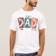 This white t-shirt features the word "DAD" in large, stylized block letters with a distressed texture and varying shades of brown, teal, and orange. Above "DAD" is the text "THE MYTH," and below are "THE MAN" on the left and "THE LEGEND" on the right, all in a smaller, simple font. The design celebrates fatherhood with a bold and legendary theme.