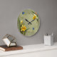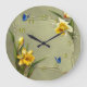 A sage green background with a subtle embossed frame decorated with lavishly decorated daffodils and a sweet blue butterfly.