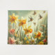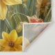This is an illustration that shows daffodils with birds flying. It has a greenish type of tone.