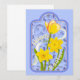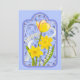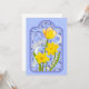 Decorative Happy Easter card; daffodils and tulip on on ornamental background, yellow, green and blue.
