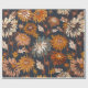 Dahlia and chrysanthemums bold seamless pattern, autumn colours, hand drawn illustration in Chinese style. Orange, teal and yellow flowers on dark background.