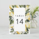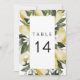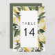 This table number features a watercolor lemon citrus tropical fruit frame and simple script font. Edit for as many numbers as you need.
