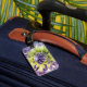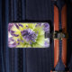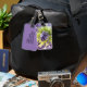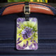 This is a picture of a purple and yellow dahlia flower on a luggage tag with a leather strap. The other side can be customized with your information.