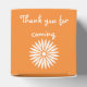 Give your guests, bridesmaids, groomsmen, or anyone else a special treat with these customizable favour boxes featuring a bright orange background with a white swallowtail butterfly, monarch butterfly, and daisy on the front, back, and top of the box. Each of these sides also features some sample text that you can customize for your own spring-themed wedding or event. Be sure to check out the other products in the Daisies and Butterflies in Orange set to create a truly coordinated look for your event.