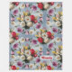 It's a fleece blanket with an illustration of a variety of flowers. There are roses, daisies, lilies, and tulips in different colours like red, white, yellow, and pink. The flowers are arranged in a circular pattern, with the largest flowers at the centre and the smaller flowers gradually getting smaller as they move outward. The background is a light blue sky with fluffy white clouds.