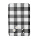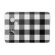 White daises with a satin white bow on white and black buffalo plaid pattern.