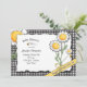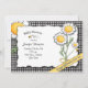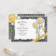 This daisy and bubble bee invitation has daisies on front and back with tiny bumble bees flying around the flowers. Background is black and white gingham.