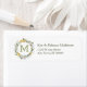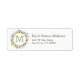 Cette étiquette d'adresse de retour a une belle couronne florale composée de marguerites jaunes et blanches, et de feuilles verts. Votre monogramme est en or assorti au centre. Votre nom et votre adresse sont à droite de l'image.
