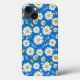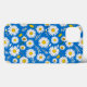 Vibrant and cheerful pattern of daisies against a bright blue background. The daisies are primarily white, with bold yellow centres, and they are arranged in a scattered yet balanced manner. In addition to the flowers, there are various green leaves and delicate stems interspersed throughout the design, adding a touch of nature and freshness. The overall composition creates a lively, summery feel, making it visually appealing and inviting.