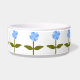 This awesome pet bowl features a digital image of a daisy with a green stem with two green leaves on it and light and dark blue coloured petals. This is a simple, yet beautiful design. The background is white.
