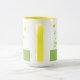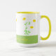 Designer yellow coffee mug, accented with greens, with a fresh white daisy print. The text can be personalized to your own inspirational message, or text is removable. Beautiful personalized custom gift idea.