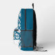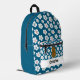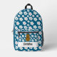 Adorable backpack featuring a cute happy cartoon brown potato. The background is a cute floral pattern of white daisy flowers on a ocean blue colour. A template below the potato to add your name.