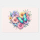 Wrapping paper sheets with a beautiful illustration. A heart-shaped bouquet of flowers in pastel blue, green, purple and yellow. With a lovely blue butterfly hovering in front.