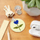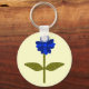 This fantastic floral keychain features a digital image of a daisy with a green stem with two green leaves on it and light and dark blue coloured petals with a light blue centre. The background is sunshine yellow.