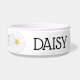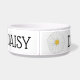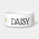 Dog bowl features an original marker illustration of a white and yellow daisy flower, with DAISY in a fun font.