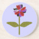 This pretty sandstone coaster features a digital image of a daisy with a green stem with two green leaves on it and purple, red and black coloured petals with a purple centre. The petals look like they are made of shining plastic that has caught the light and caused an iridescent effect. The background is a calming blue colour.