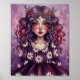 Whimsical poster featuring a portrait of a wide-eyed girl with cascading purple curls, a berry-and-flower crown, rosy cheeks and a daisy patterned dress on a mauve backdrop. Finished in a oil acrylic impasto painterly style.
