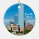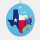 Two sided ornament featuring Downtown Dallas, and with the Texas state outline and flag colour logo plus bluebonnets.