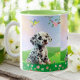 This adorable mug features a cute baby Dalmatian puppy sitting in a garden of flowers, perfect for any animal lover or lover of springtime. The vibrant and colourful design is sure to brighten up your day and make your morning coffee or tea even more enjoyable. It's also a great gift idea for someone special who loves cute animals and unique designs. This custom mug is perfect for celebrating the joys of spring and the love of puppies. Use it to enjoy your favourite beverage or add some fun and whimsy to your home decor. This custom mug is a great way to show off your love for cute animals and enjoy a fun and playful design. Order now and bring some puppy love to your daily routine!