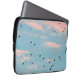 The pastel, dalmatian spotted print on this 13” Laptop Sleeve was created from an original photograph by ZoeSPEAK of an aqua blue sunset sky filled with puffy pink clouds and a flock of black birds. The birds become abstract black shapes scattered across the soft aqua and pink sky.