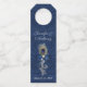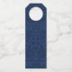 Elegant wedding bottle hanger done in a blue on blue damask pattern, with graphics of a peacock feather, silver swirls, pearls and a blue bow. Personalize the custom text to suit your wedding needs. Makes great wine bottle favour tags for your wedding guests.