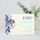 Elégant motif damassé bleu marine, aqua, mariage ivoire RSVP réponse/réponse carte. Un design mariage moderne mais classique avec une touche rétro. Un design mariage délicat et vintage, parfait pour un mariage de printemps ou d'été contemporain ou traditionnel.