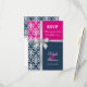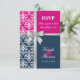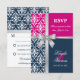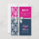 © Socialite Designs. Elegant wedding invitation RSVP card for a summer wedding incorporating white damask, a printed cross silver ribbon and bow, and two background colours of navy blue and fuchsia. Please contact Socialite Designs if you would like a different colour combination, help with customizing, or other wedding products created with this design. PLEASE NOTE THAT THE RIBBON IS AN IMAGE AND IS PRINTED ONTO THE INVITATION.