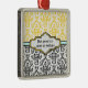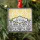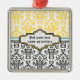 Damask pattern black white yellow aqua ornament. The upper part is of yellow and white damask pattern and the bottom part is of black and white. An aqua stripe separates the two parts. Your text is typed on an elegant label with white and yellow outline. A great keepsake for special occasions weddings, birthdays, anniversaries.